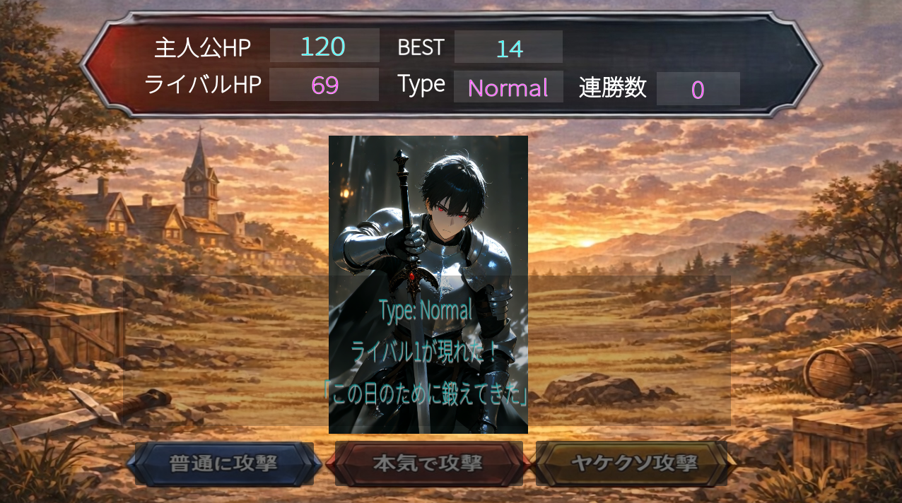 3つの攻撃から行動を選び、ライバルごとに変わる強さや運要素を乗り越えながら撃破数を伸ばしていきます。